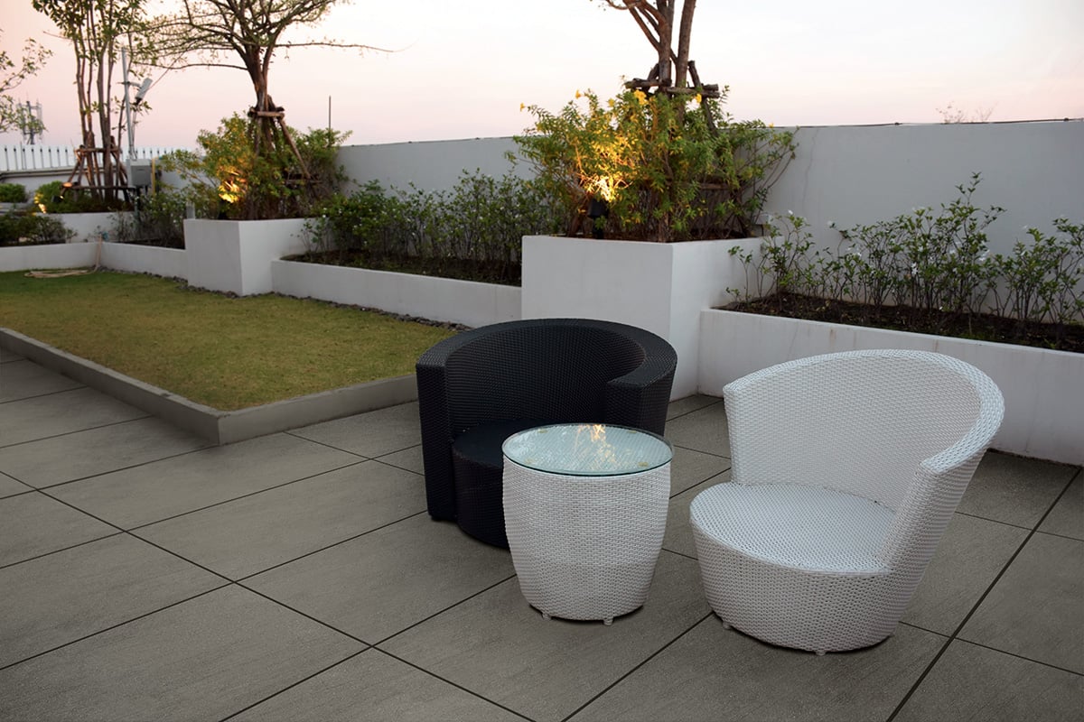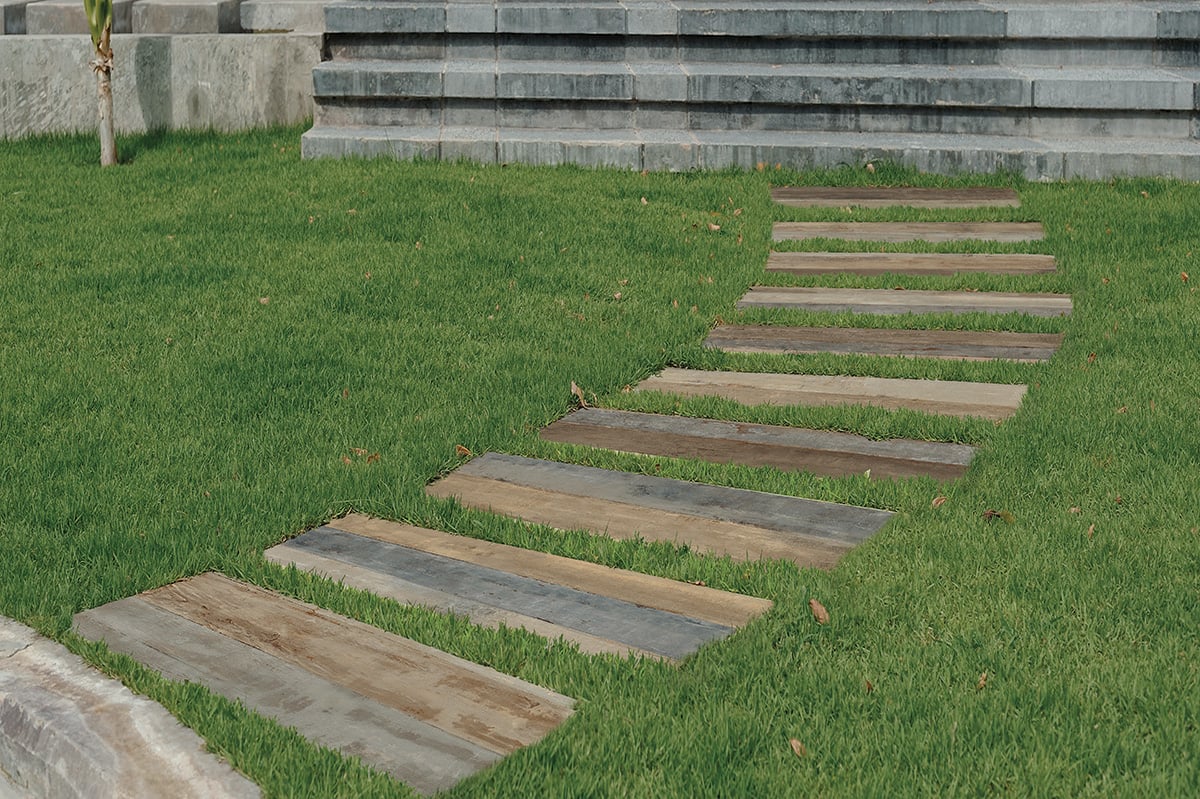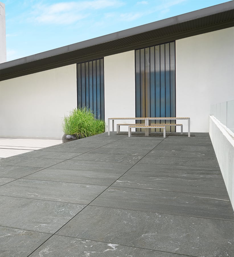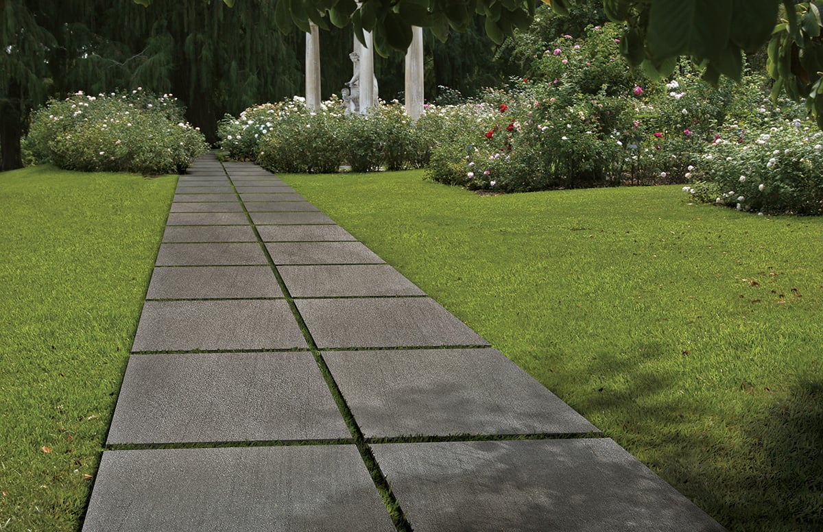 Die Platten lassen sich auf verschiedene Arten verlegen. Sie können direkt in Splitt, mit kleinen Fugen verlegt werden, oder auf einen bestehenden Betonbelag geklebt werden, mit oder ohne Fugen. Die Feinsteinzeugplatten eignen sich ebenso für Wege und Gartensitzplätze.